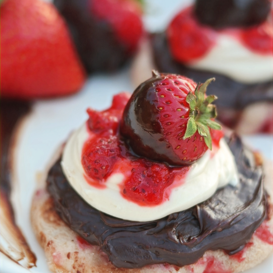 Strawberry cookie topped w strawberry cream cheese frosting topped with a chocolate ganache topped with a strawberry sauce and a sliced strawberry.