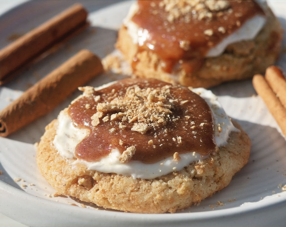 Snickerdoodle base cookie rolled in graham cracker crumbs toped with cream cheese frosting with a cinnamon glaze on top.